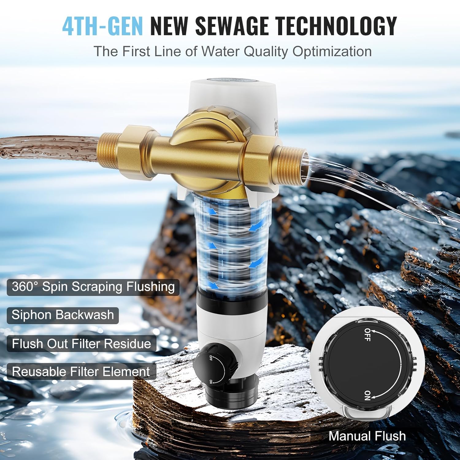 VEVOR Sediment Filter, 360° Mountable Spin Down Sediment Filter, 4Th Gen Backwash Pre-Filtration, Bi-Side Scraper Flush, 20 GPM Reusable Whole House Sediment Water Filter, Pressure Gauge, 3/4 MNPT